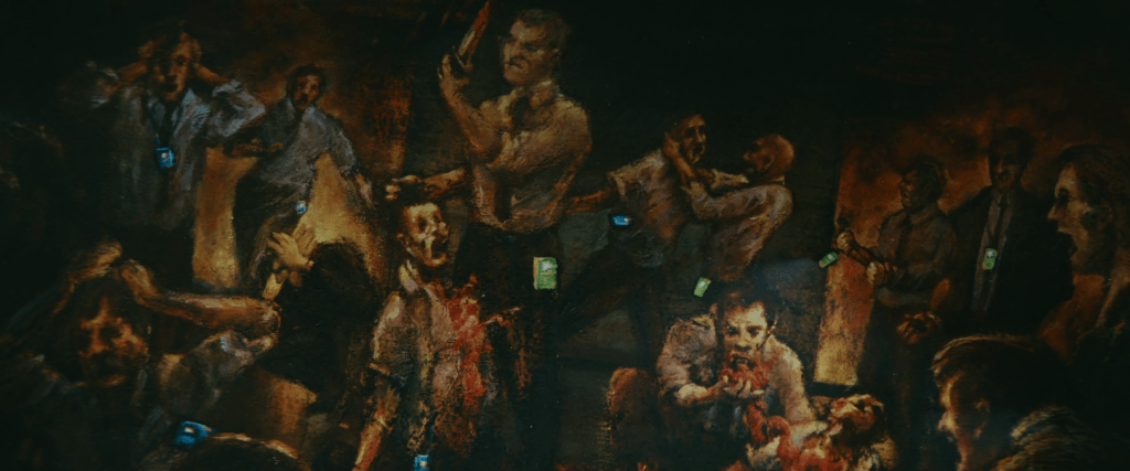 Interestingly, artwork produced by artificial intelligence functions very much in the same way, riffing off of existing artwork and style. The painting Kier Invites You to Drink of His Water, for instance, depicting a lone Romantic figure looking out over a vast pastoral scene, is an obvious reiteration of Friedrich’s 1818 Wanderer Above the Sea of Fog, while the infamously Goyesque painting The Grim Barbarity of Optics and Design is an assumed retelling of Greco’s 1658 Christ Driving the Money Changers from the Temple. It’s the latter which is truly evocative of AI-produced artwork. The painting illustrates the severed workers in a violent, harrowing brawl, yet the way in which the Lumon ID badges are depicted so blatantly is highly evocative of an AI-generated image with the prompt: “Create me a painting in the style of Goya which depicts Lumon workers in the midst of a violent biblical scene”. The presence of such artworks speak to and only confirm the way in which Lumon, and by extension corporate power, can —or will soon be able to— recreate, post-edit and monopolise the works of others and claim them as their own.