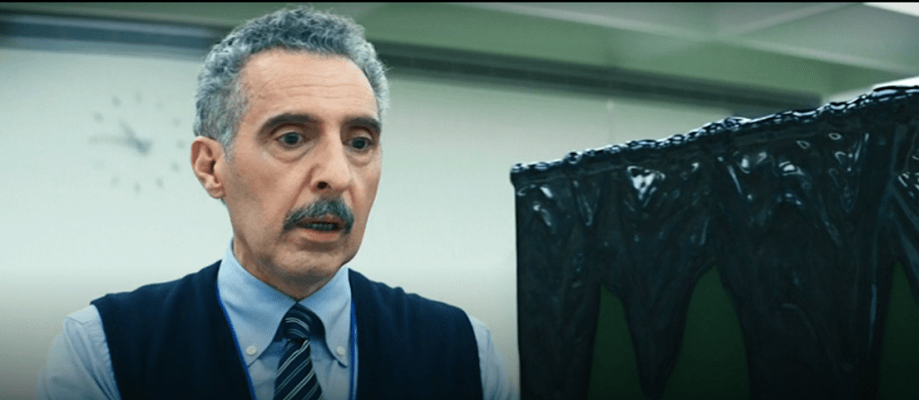Perhaps it’s a very Catholic brand of guilt, then, that haunts the rule-abiding, Eagan-worshipping Irving. Having taken to drifting off on the job, Irving begins to experience horrific nightmares in which a thick black oil oozes down from the office ceiling to engulf his work cubicle and him with it — not before seeping out from the eyes of his concerned colleagues. It’s later revealed that Irving’s outie spends the bulk of his spare time obsessively painting and re-painting nightmarish illustrations of the hallowed, rarely discussed Testing Room entrance (a long, dark corridor with a hellish red light at its end) – painted in an oozing, oily black acrylic, the same sickly, far-reaching goo which threatens to swallow him whole in the office. And it’s no accident that the substance which threatens to consume Irving is oil-like in consistency and colour, given oil’s near-religious status as a symbol of modern rampant capitalism, a measure by which much of the market exists. After all, Lumon’s logo is stylised to contain a large, thick droplet in its design. Guilt (or the mere anticipation of guilt) and adulation of the great souls who came before us are the two quasi-religious forces that coax Lumon’s severed workforce, between which poor Irving is miserably entrenched.