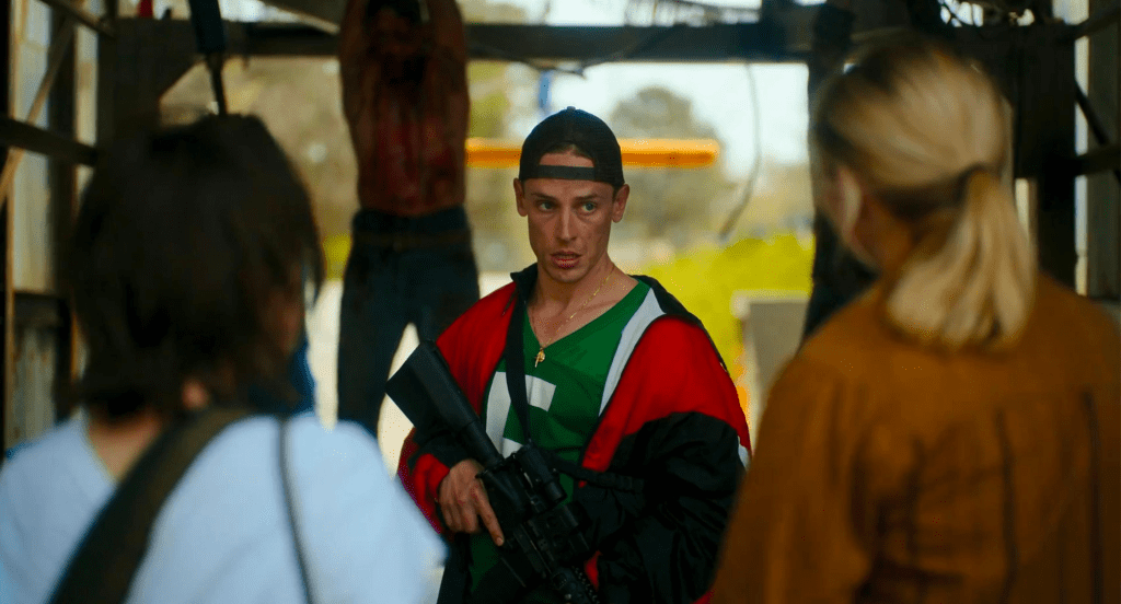 Shunning cliche, Garland paints his civil war as a self-made American phenomenon, punctuating its horror with an acerbic, ironical soundtrack. Scenes of violent unrest, for instance, are juxtaposed with grungy, disaffected electric-rock sounds of Silver Apples. Long vistas of burnt-out or abandoned cars and homes that dot the group’s journey to the capital are backed with the beat-laden churns of the psy-punk band Suicide. Routine executions of prisoners, captured by the WF in a loyalist-held building, are played out to a vivacious De La Soul tune, and as the Americans killed at the hands of Americans are shot, they drop to the ground in slow motion to the up-beat, definitive sound of America; their bodies ripple with an excessive slew of bullets in a cathartic carnival of barbarity not unlike the clownery of the loyalists.