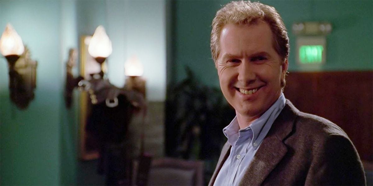 His masterplan? Through leveraging Sunnydale’s supernatural forces forging an alliance with the verminous principal Snyder, Wilkins plans on hijacking Buffy’s graduation ceremony as keynote speaker in order to carry out an “Ascension.” That is, during his speech, the Mayor will metamorphose into a giant snake-demon — a demon in its “purest” form untethered by the human body — and feed greedily off the students before him. Despite Buffy’s efforts to stop him, Wilkins succeeds in ascending (complete with some fine ’90s special effects), only to face the Scooby gang and a rallied-up class of ’99 before ultimately being blown to smithereens.