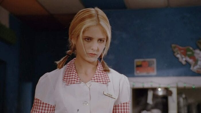 The premiere episode of Buffy the Vampire Slayer’s pivotal third season, “Anne,” is symbolic to say the least. In it, we follow “chosen one” slayer Buffy (Sarah Michelle Gellar) attempt to lead a civilian life under the alias Anne (her middle name), having left Sunnydale after the bulk trauma of being expelled from Sunnydale High, kicked out of her home by mother Joyce (Kristine Sutherland), and being forced to kill vampire-boyfriend-turned-post-coital-monster Angel (David Boreanaz). Incognito, she waits tables in an especially seedy Los Angeles. There, few acknowledge Buffy/Anne except the kind, compassionate Ken (Carlos Jacott), who hands out flyers offering to support the young “lost souls” of LA.