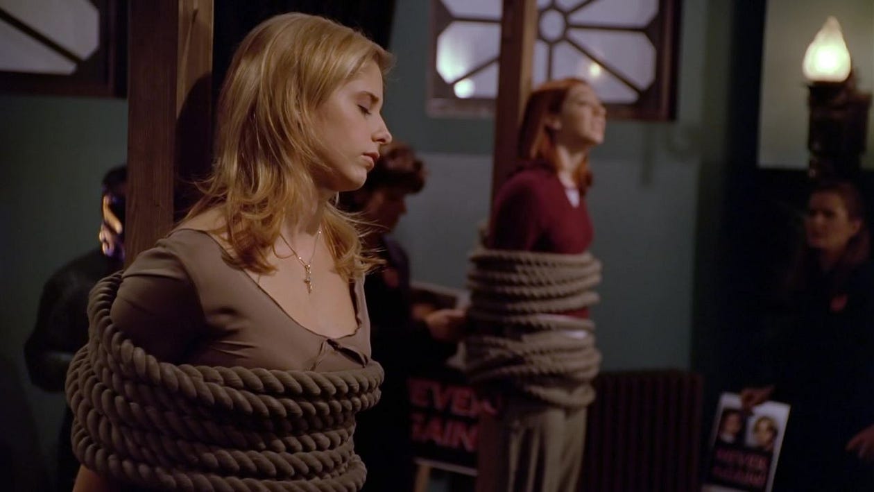 Under the children’s sway, and with the help of youth-averse principal Snyder (Armin Shimerman), Joyce has libraries pillaged and witchcraft paraphernalia confiscated by the police, all in the name of purifying the town’s youth and taking back control. Buffy, practicing witch Willow and her wicca friend Amy are then captured in a bonafide witch hunt, tied to stakes buried in mounds of textbooks and — were it not for Giles and Cordelia who intervene and help Buffy break the curse — almost burnt alive.