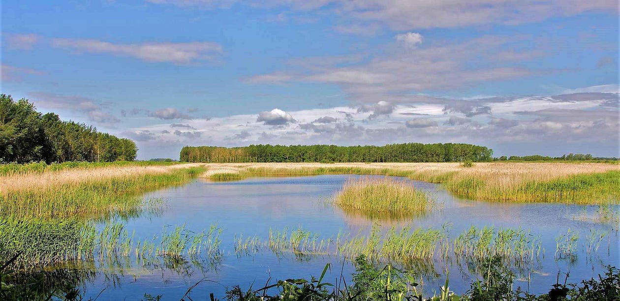 Archaeologist Francis Pryor writes of the Fens, south-east England, that “if any landscape can provide darkness, with a very real hint of menace, it is most surely the Fens.” Fen aficionado and poet Edward Storey, meanwhile, writes of the precarious wetlands that inspired his work, that, “You walk the roof of the world here. / Only the clouds are higher and they are not permanent . . . Here, you must walk with yourself, / Or share the spirits of forgotten ages.” Storey’s words hauntingly capture the vertiginous, vast claustrophobia we find in such flat spaces, their end-of-the-world quality forcing visitors to invent or see things that aren’t there — the “spirits of forgotten ages” or the invisible “menace” evoked by Pryor.