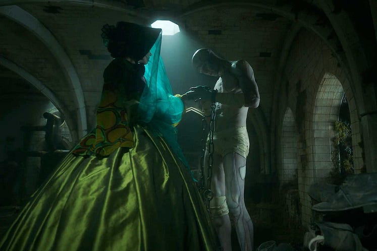 Colour in the film brilliantly illustrates this nature/man divide — despite Netflix’s customary steamrolling effect that altogether obliterates the gothy darkness Del Toro no doubt aims for (and which Robert Eggers’ Nosferatu of this year excelled at). The retroflective, vibrant green of Elizabeth’s crinoline — which, wearing it often, she becomes indistinguishable from — is the symbolic antithesis to the ruinous red of mankind found in the crimson dress Victor’s mother wears early in the film before her death by childbirth (that is, quite literally, man-made death). A colour synonymous with violence and death (as well as passion, ambition), red crops up again and again in relation to Victor and his unstoppable drive for success. Take the bright red gloves he dons as a toiling scientist — sheathing his destructive hands — or the giant electricity generators required to galvanise his Monster which, when used, light up in a fiery, foreboding red; it appears most obviously when, in a strangely homoerotic scene, Victor awakes to see his creation emerge at the foot of his bed, his red gloves matching the bright, silky red blanket that covers his near-nude body.
